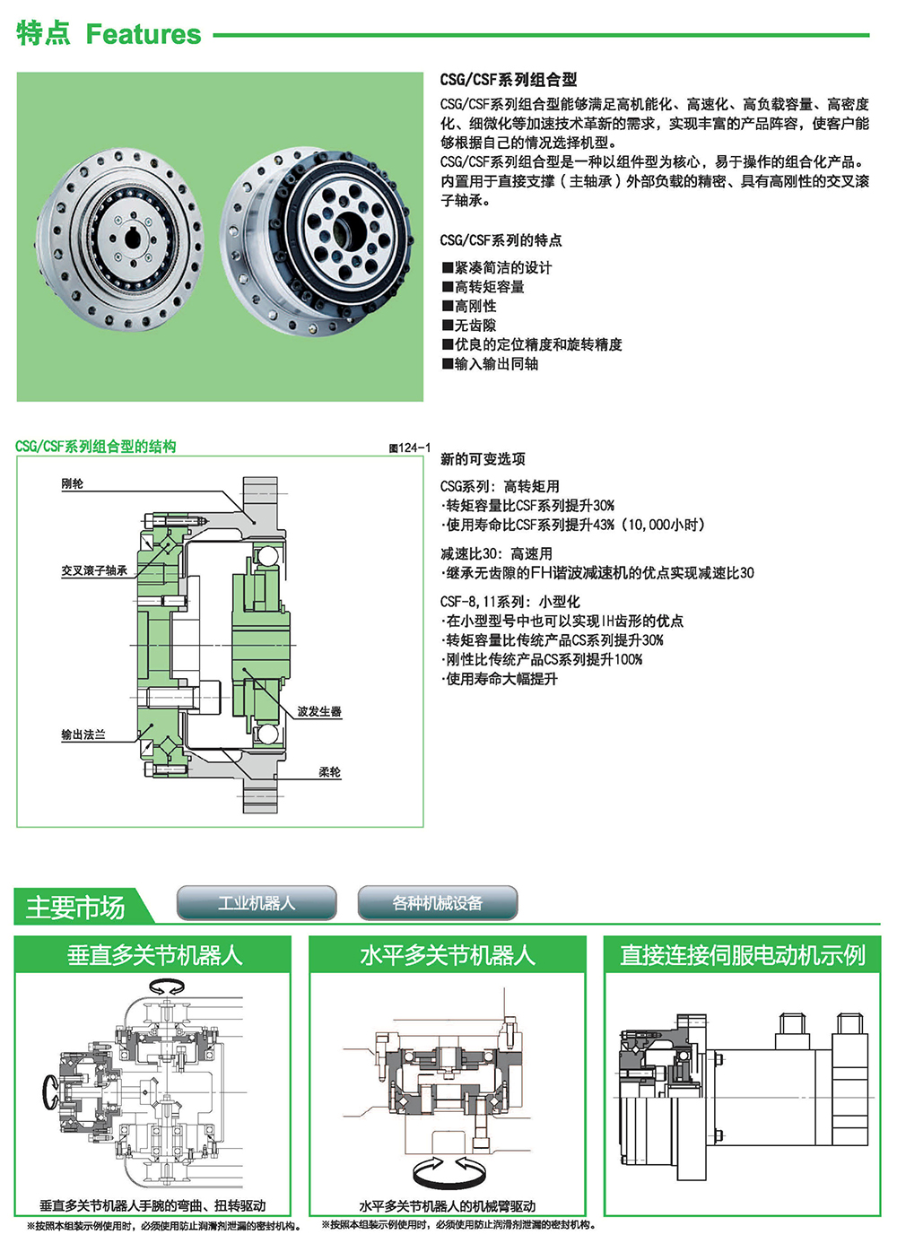 CSG/CSF系列組合型能夠滿(mǎn)足高機(jī)能化、高速化、高負(fù)載容量、高密度化、細(xì)微化等加速技術(shù)革新的需求,實(shí)現(xiàn)豐富的產(chǎn)品陣容,使客戶(hù)能夠根據(jù)自己的情況選擇機(jī)型。