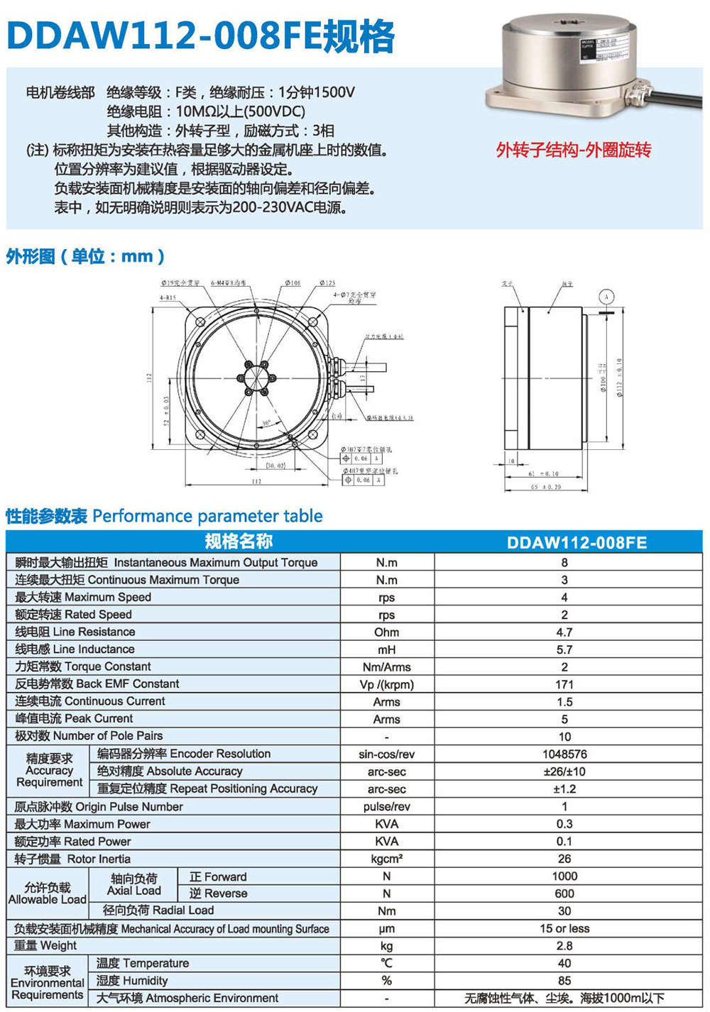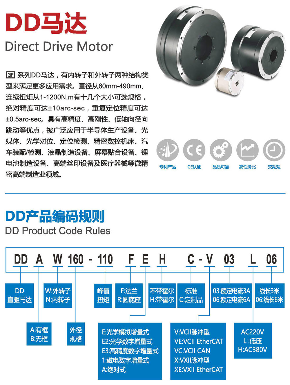 3F系列DD馬達(dá),有內(nèi)轉(zhuǎn)子和外轉(zhuǎn)子兩種結(jié)構(gòu)類 型來滿足更多應(yīng)用需求。直徑從60mm- 490mm、 連續(xù)扭矩從1-1200N.m有十幾個大小可選規(guī)格, 精度可達(dá)+10arc-sec,重復(fù)定位精度可達(dá) +0.5arc-sec。具有高精度、高剛性、低軸向徑向 跳動等優(yōu)點(diǎn),被廣泛應(yīng)用于半導(dǎo)體生產(chǎn)設(shè)備、光 媒體、光學(xué)對位、定位檢測、精密數(shù)控機(jī)床、汽 車裝配/檢測、液晶制造設(shè)備、屏幕貼合設(shè)備、鋰 電池制造設(shè)備、高端絲印設(shè)備及醫(yī)療器械等微精 密高端制造業(yè)領(lǐng)域。