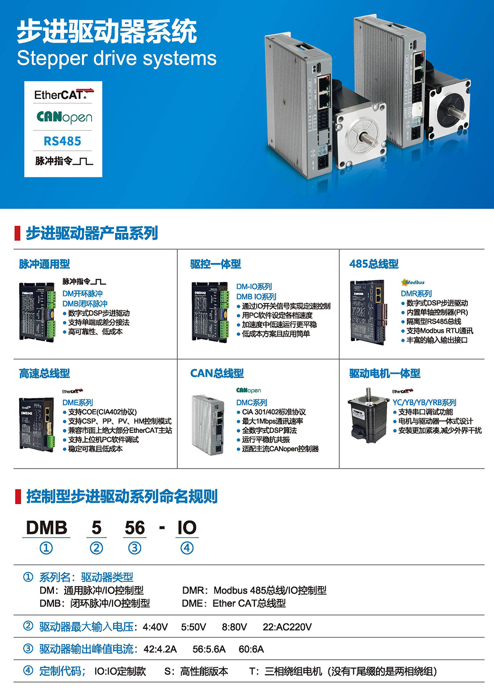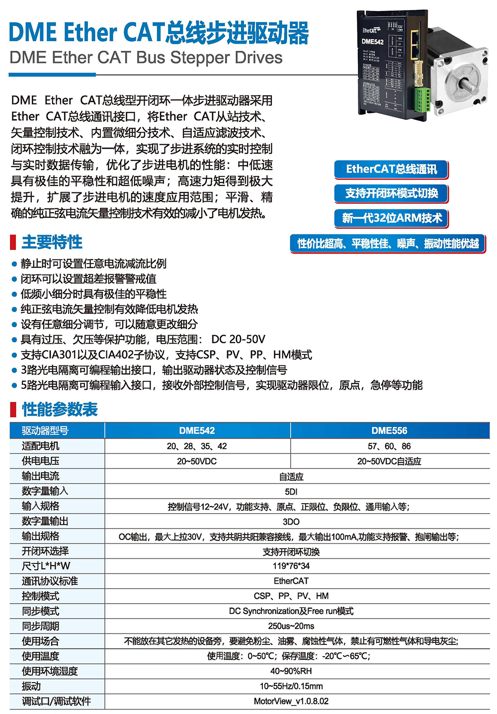 DME Ether CAT總線型開閉環(huán)- -體步進驅(qū)動器采用Ether CAT總線通訊接口,將Ether CAT從站技術(shù)、矢量控制技術(shù)、內(nèi)置微細分技術(shù)、自適應(yīng)濾波技術(shù)、閉環(huán)控制技術(shù)融為一-體, 實現(xiàn)了步進系統(tǒng)的實時控制與實時數(shù)據(jù)傳輸,優(yōu)化了步進電機的性能:中低速具有極佳的平穩(wěn)性和超低噪聲;高速力矩得到極大提升,擴展了步進電機的速度應(yīng)用范圍;平滑、精確的純正弦電流矢量控制技術(shù)有效的減小了電機發(fā)熱。