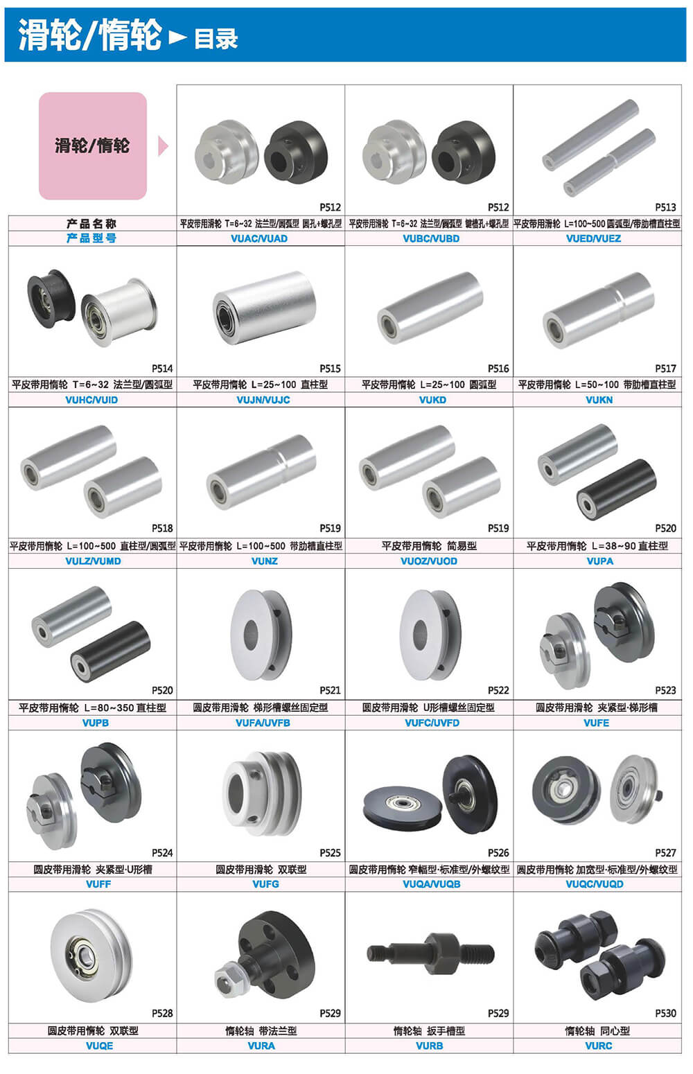 滑輪惰輪在機(jī)械設(shè)備中與平皮帶圓皮帶配合使用,起到動(dòng)力傳遞、輸出、過(guò)渡、皮帶張緊用等,用于皮帶張緊時(shí)也可稱作張緊輪