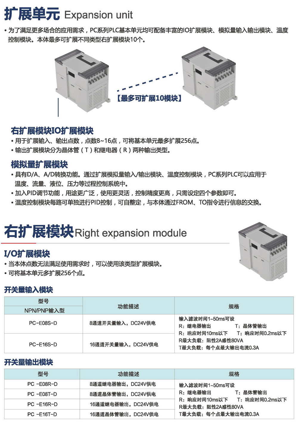 為了滿足更多場合的應用需求, PC系列PLC基本單元均可配備豐富的IO擴展模塊、模擬量輸入輸出模塊、溫度 控制模塊。本體可擴展不同類型右擴展模塊10個。