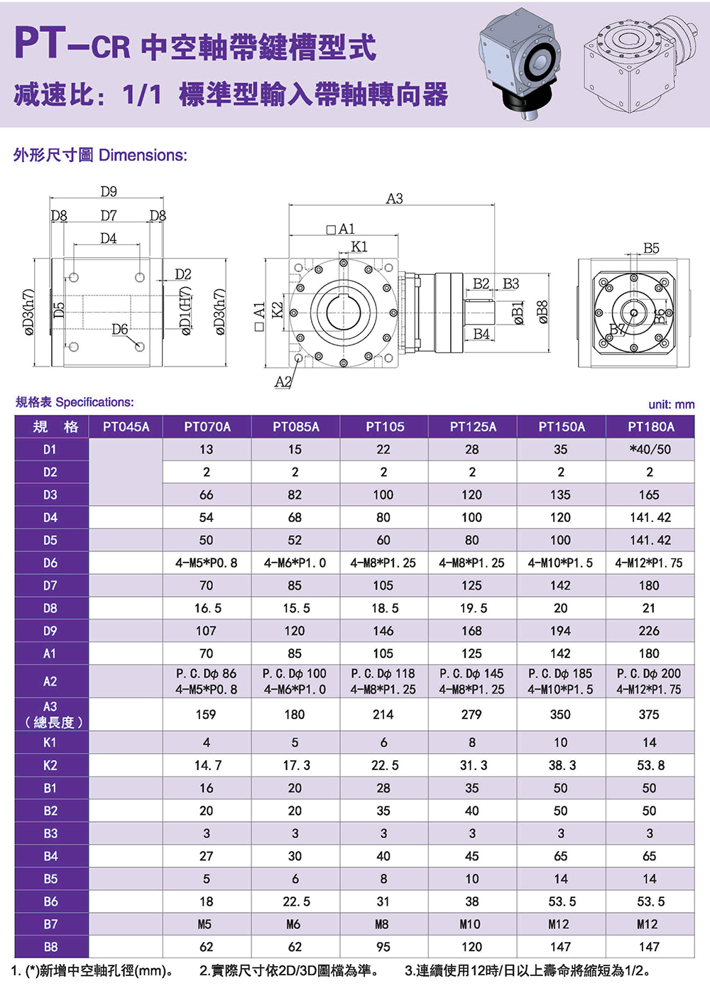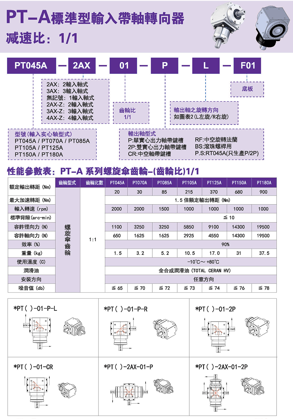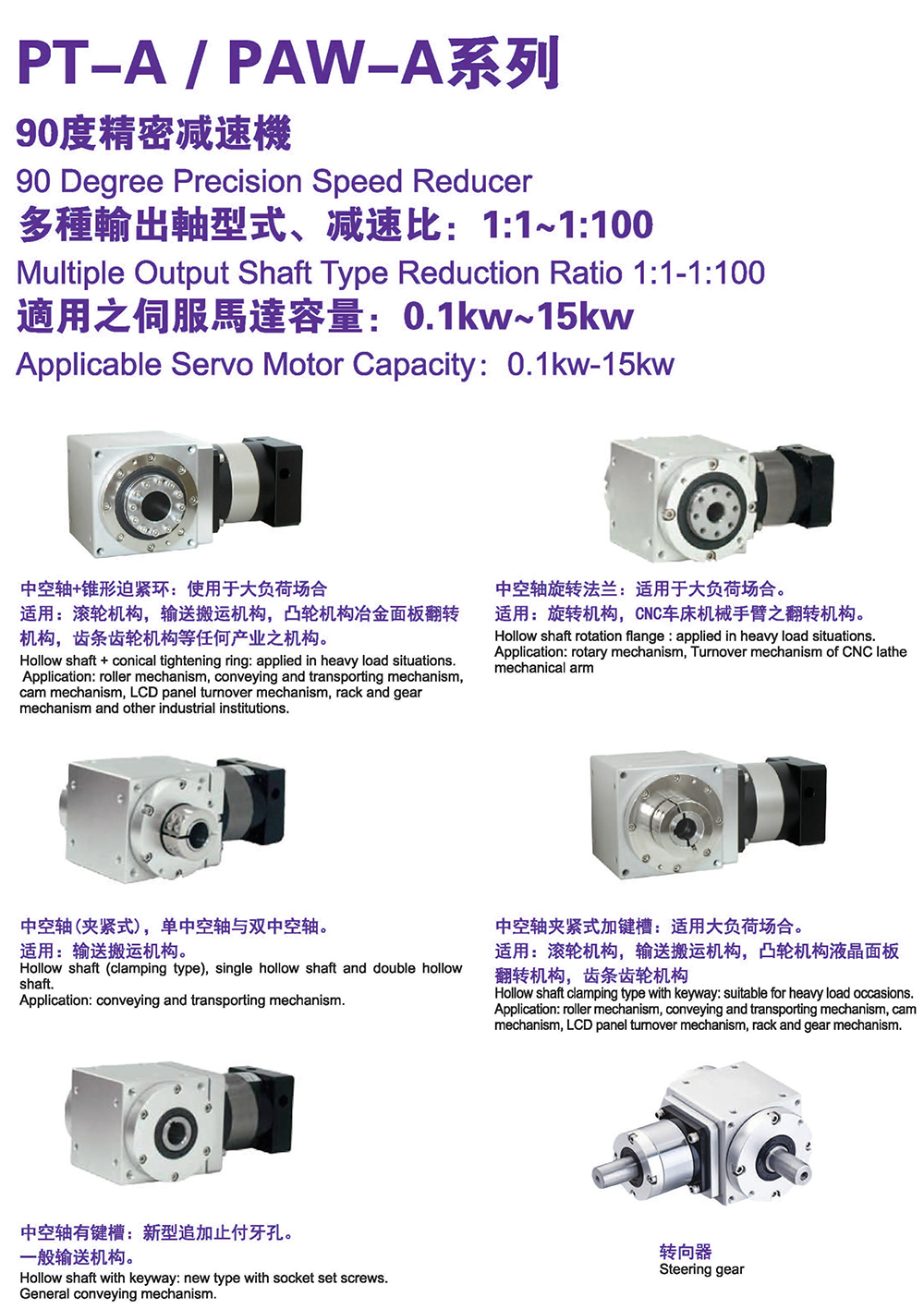 多樣化:輸出軸種類多樣化,有單出力軸型、雙出力軸型、中空軸型、中空法蘭型、中空軸錐形緊迫性、螺桿直線型、螺牙直線型。