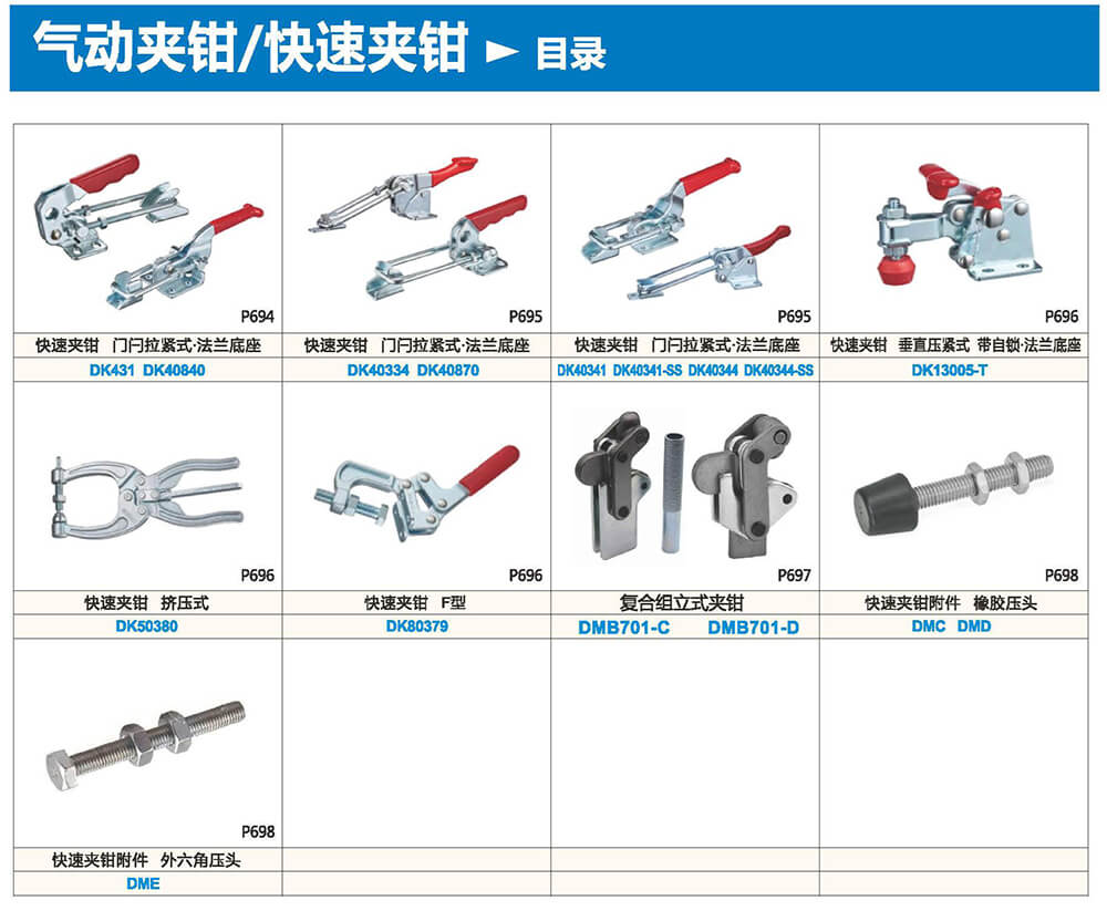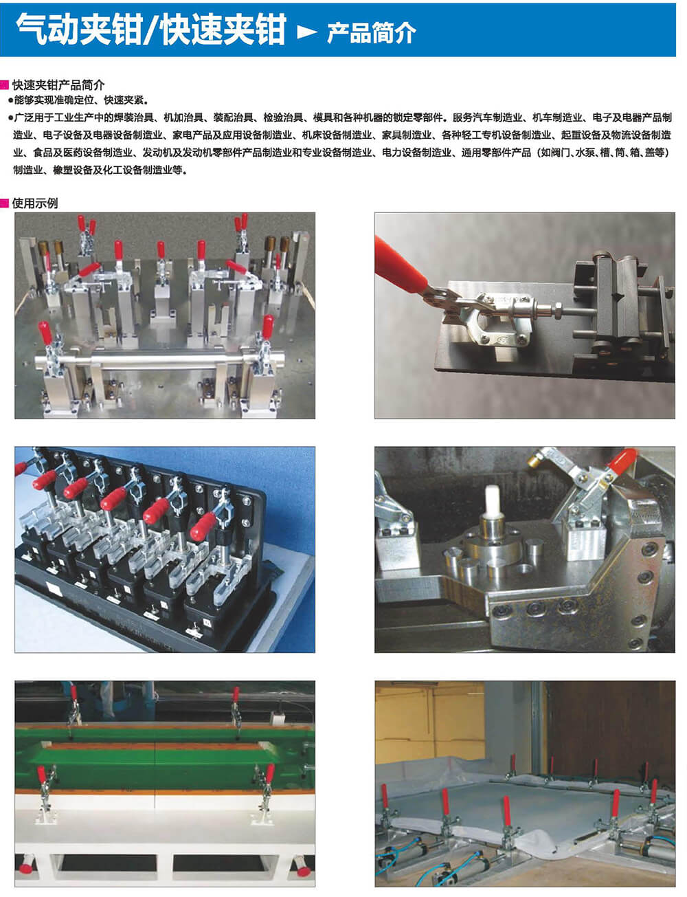 廣泛用于工業(yè)生產(chǎn)中的焊裝治具、機(jī)加治具、裝配治具、檢驗(yàn)治具、機(jī)具和各種機(jī)圈的鎖定零部件。服務(wù)汽車制造業(yè)、機(jī)車制造業(yè)、電子及電器產(chǎn)品制造業(yè)、電子設(shè)備及電器設(shè)備制造業(yè)、家電產(chǎn)品及應(yīng)用設(shè)備制造業(yè)、機(jī)床設(shè)備制造業(yè)、家具制造業(yè)、各種輕工專機(jī)設(shè)備制造業(yè)、起重設(shè)備及物流設(shè)備制造業(yè)、食品及醫(yī)藥設(shè)備制造業(yè)、發(fā)動機(jī)及發(fā)動機(jī)零部件產(chǎn)品制造業(yè)和專業(yè)設(shè)備制造業(yè)、電力設(shè)備制造業(yè)、通用零部件產(chǎn)品(如閥門、水泵、槽、簡、箱、蓋等)制造業(yè)、橡塑設(shè)備及化工設(shè)備制造業(yè)等。