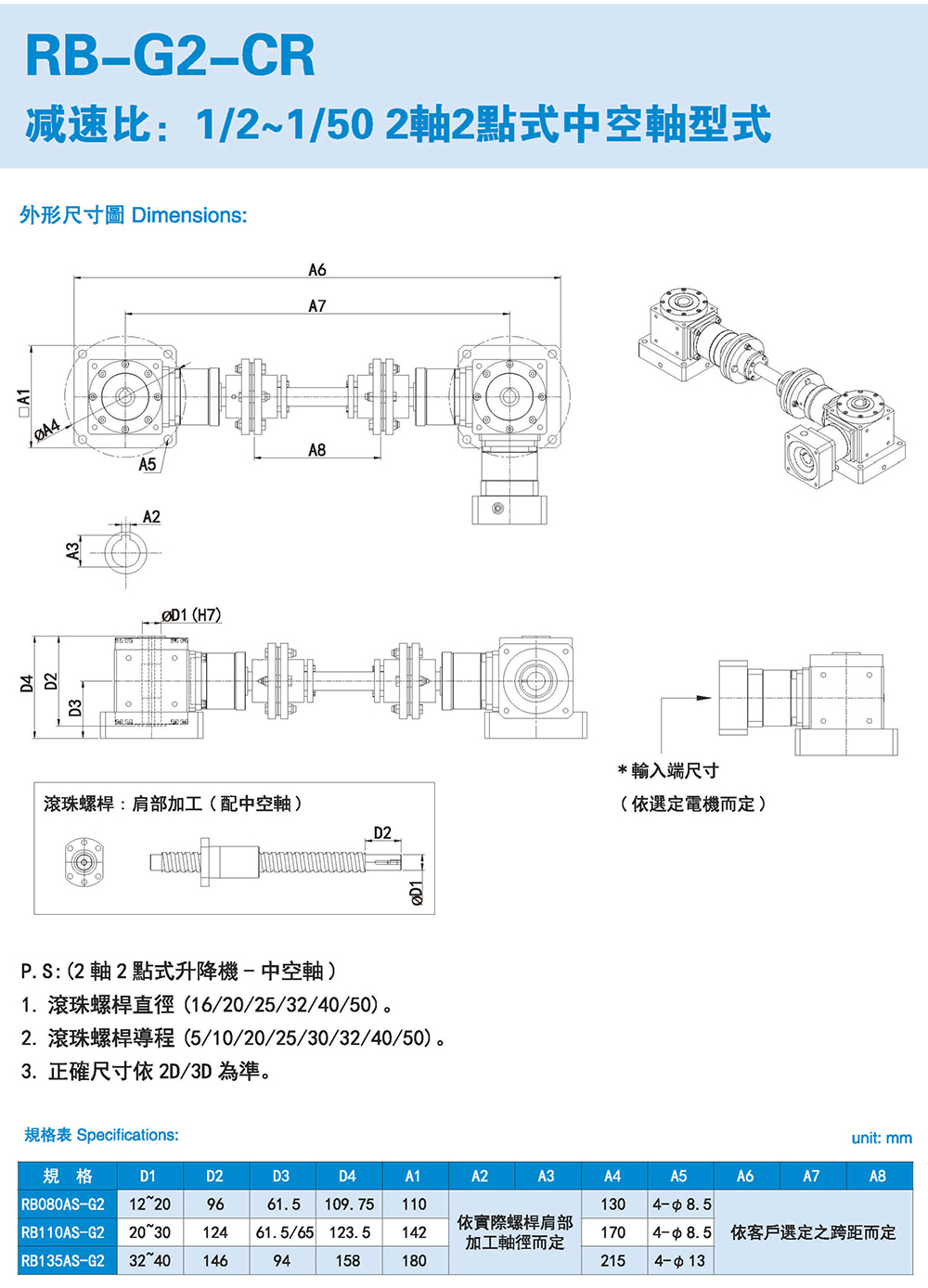 多樣化:輸出軸種類多樣化,有單出力軸型、雙出力軸型、中空軸型、中空法蘭型、中空軸錐形緊迫性、螺桿直線型、螺牙直線型。