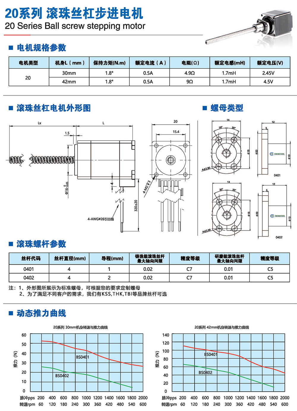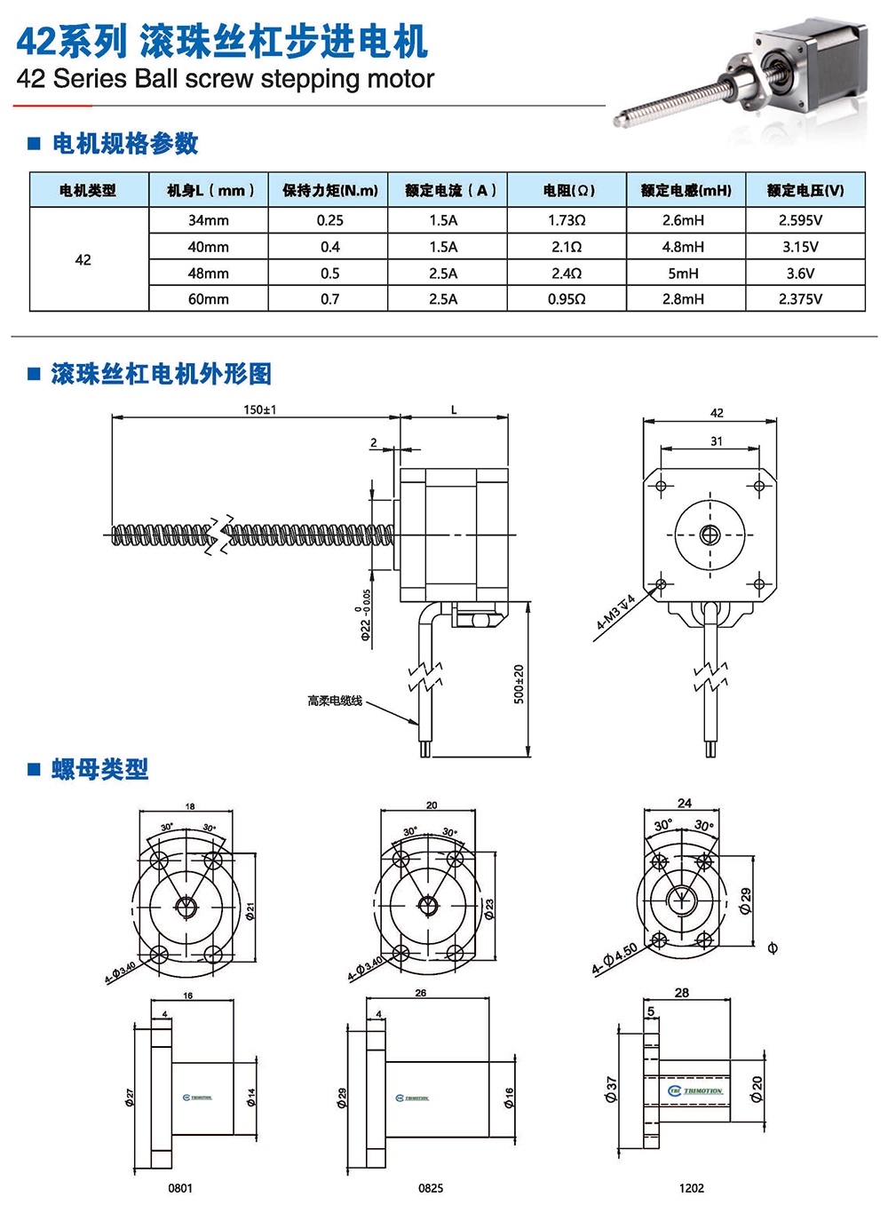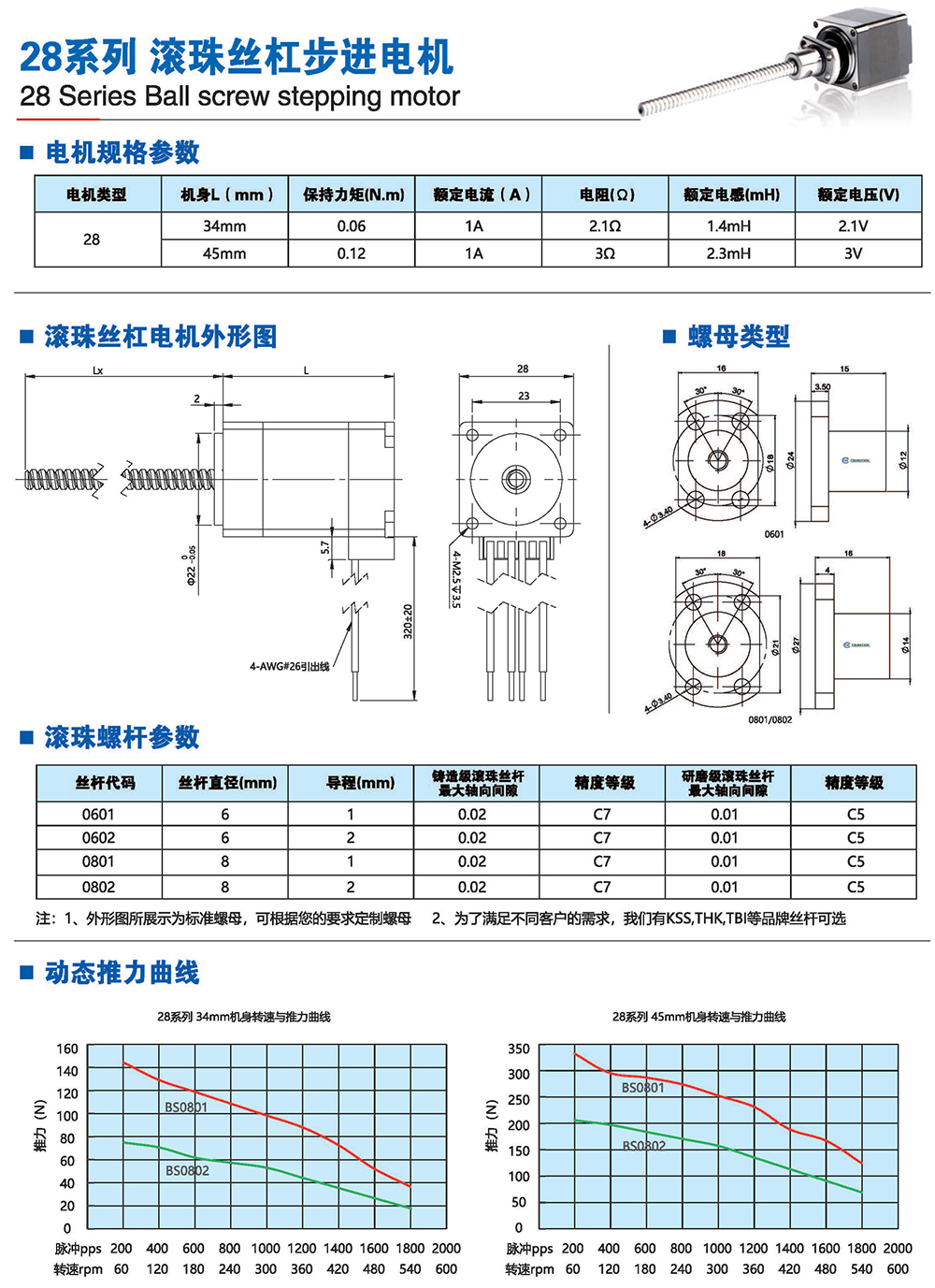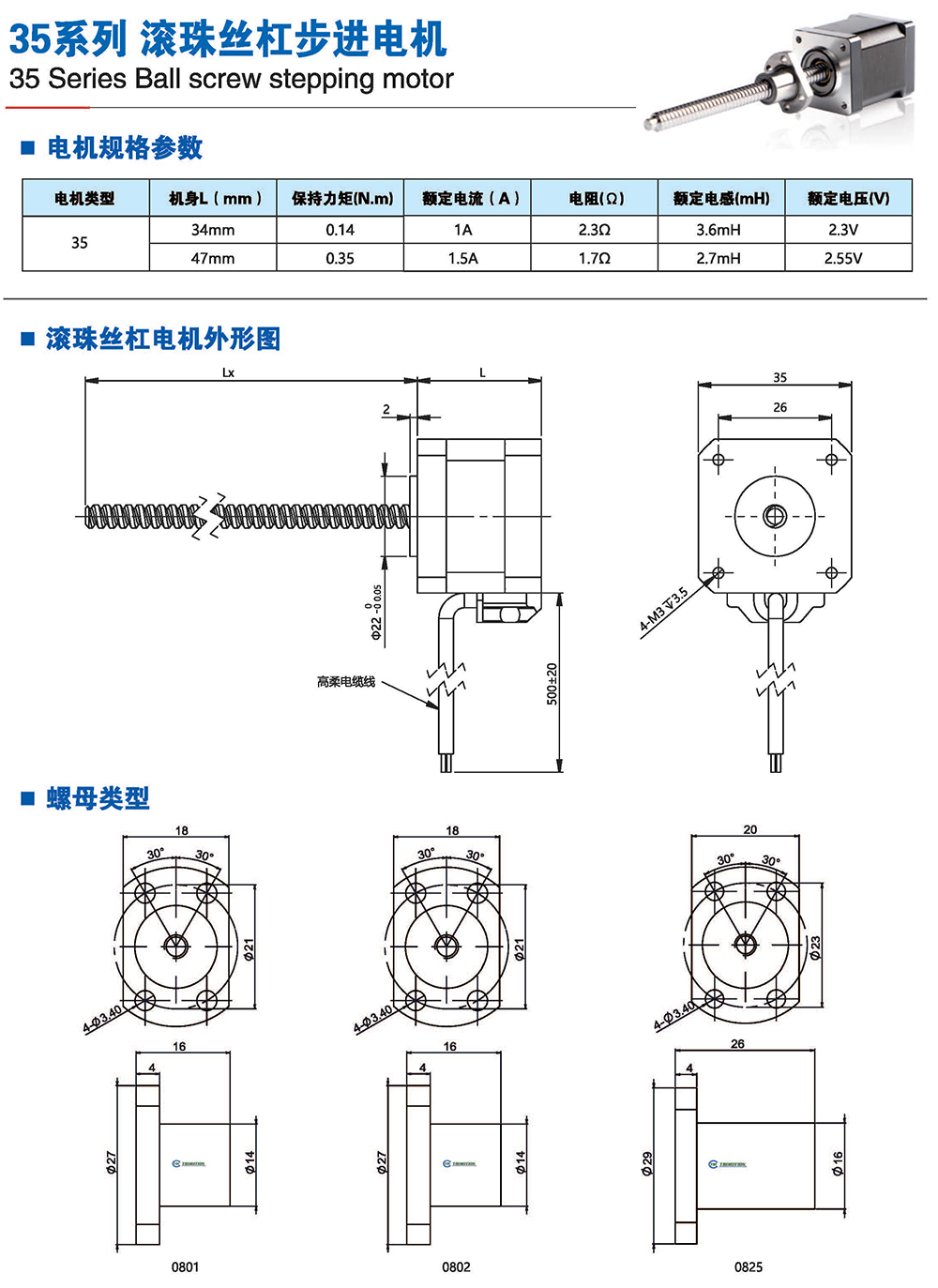 滾珠絲桿步進電機有六種尺寸,外形尺寸從14mm至86mm,滾珠絲桿電機為外部驅(qū)動式。 從0.005mm/步到0. 1mm/步,有多種步長可選。推力可達1600N,全系可 選配編碼器。