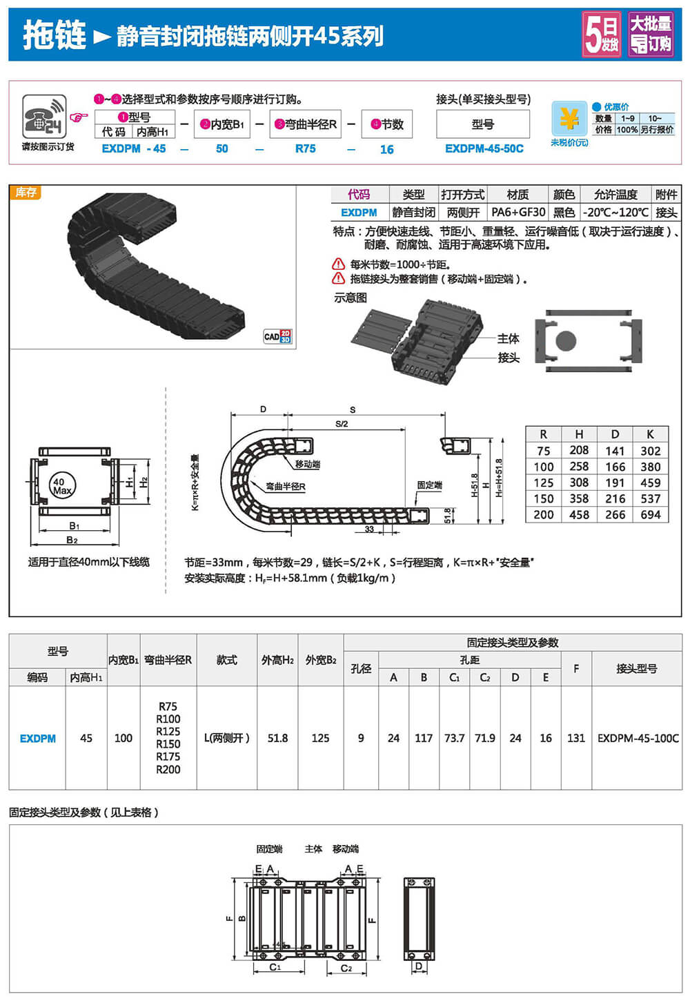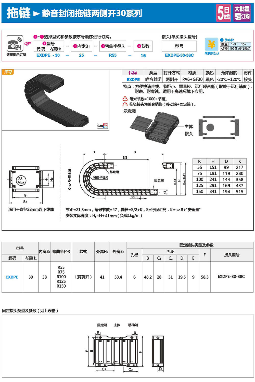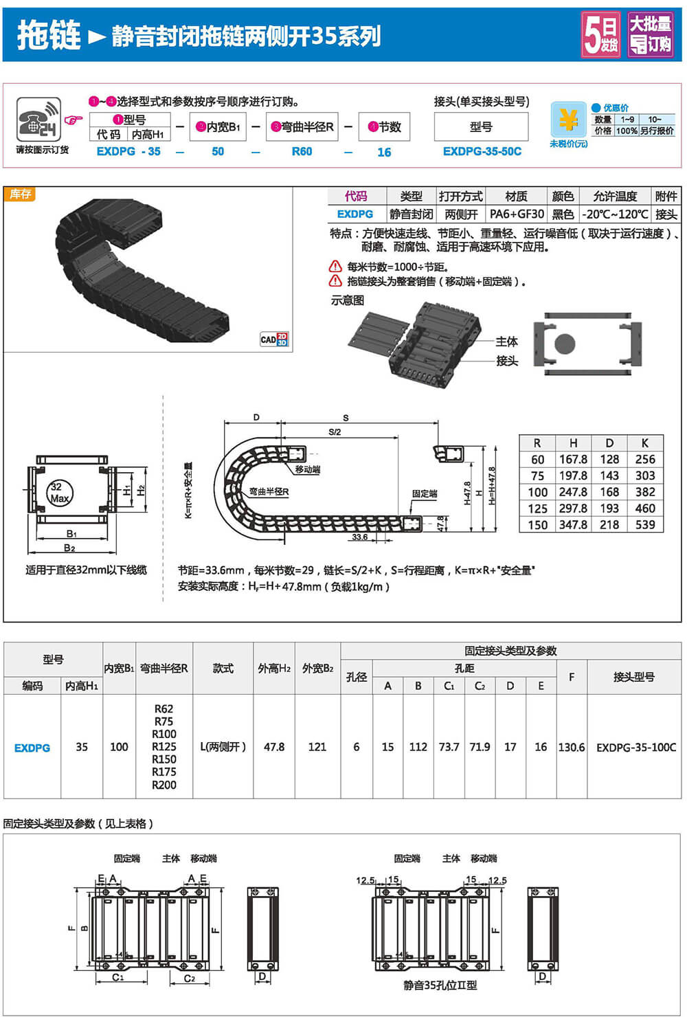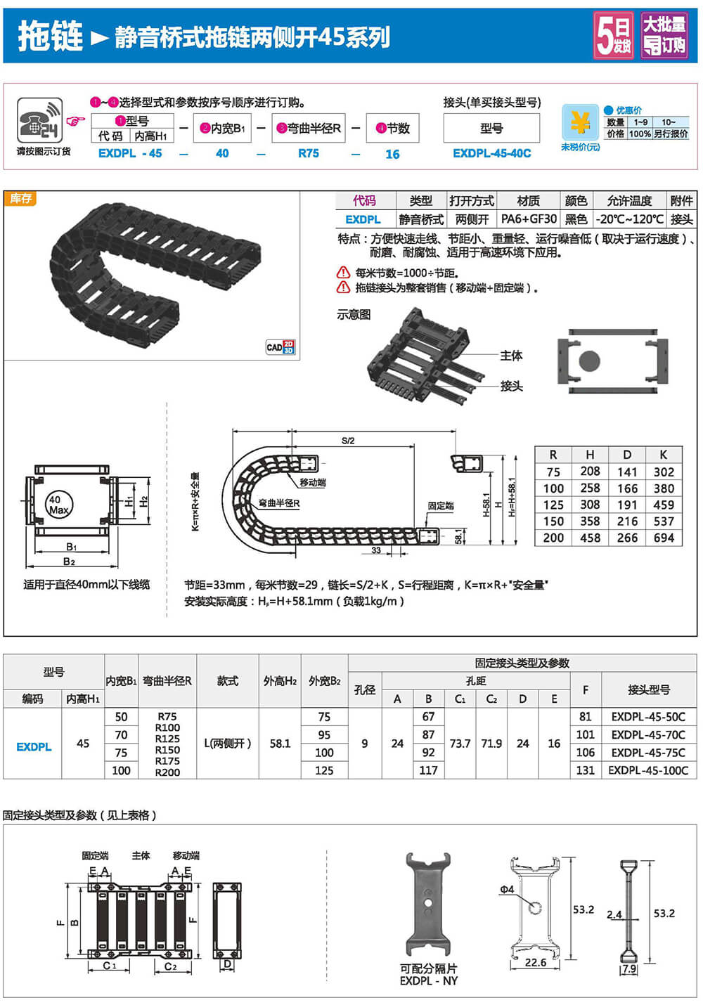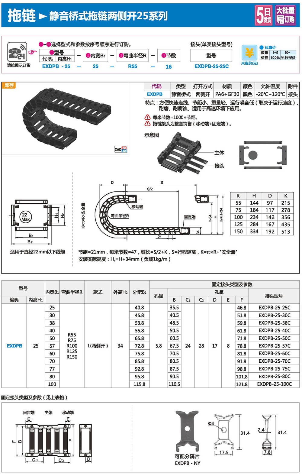 適合于使用在往復(fù)運(yùn)動(dòng)的場(chǎng)合,能夠?qū)?nèi)置的電纜、油管、氣管、水管等起到牽引和保護(hù)作用,拖鏈每節(jié)都能打開,便于安裝和維修。運(yùn)動(dòng)時(shí)噪音低、耐磨、可高速運(yùn)動(dòng)。拖鏈已被廣泛應(yīng)用于數(shù)控機(jī)床.電子設(shè)備、石材機(jī)械、玻璃機(jī)械、門窗機(jī)械、注塑機(jī)、機(jī)械手、起重運(yùn)輸設(shè)備、自動(dòng)化倉(cāng)庫(kù)等。
