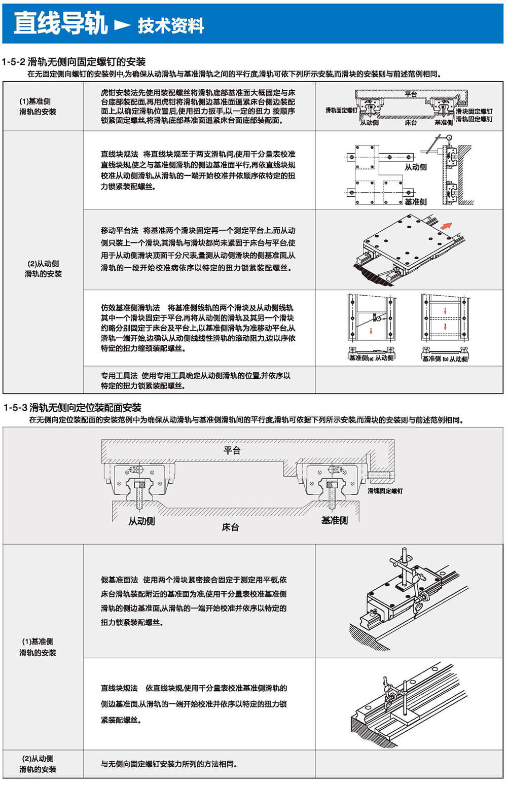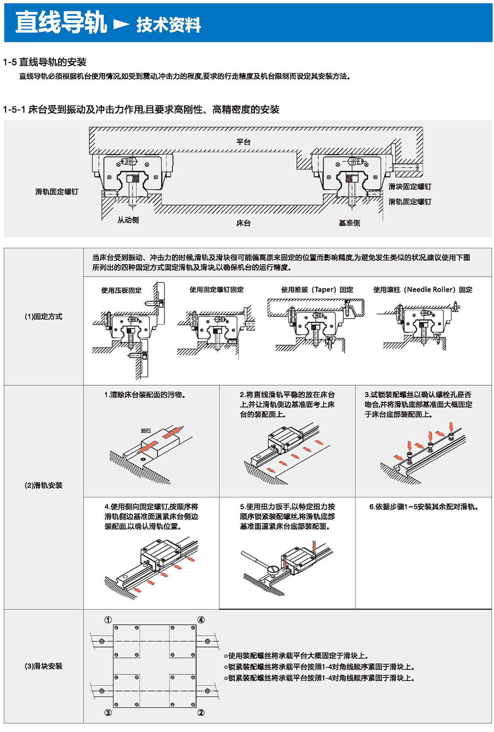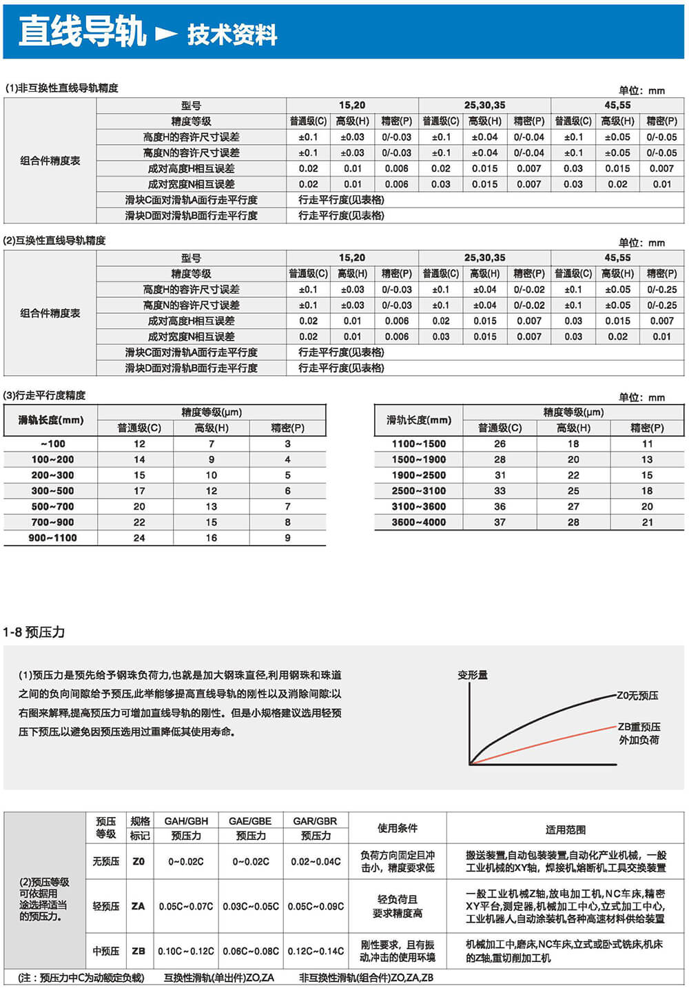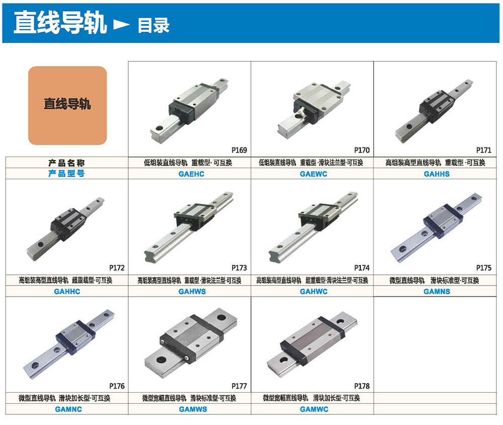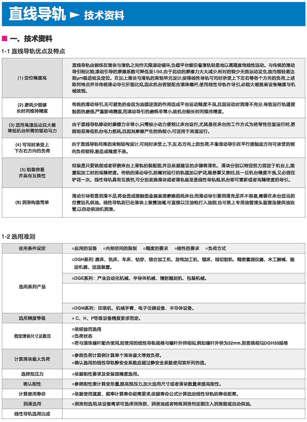 直線導(dǎo)軌由鋼珠在滑塊與滑軌之間作無限滾動(dòng)循環(huán)負(fù)載平臺(tái)能沿著滑軌輕易地以高精度做線性運(yùn)動(dòng)。與傳統(tǒng)的滑動(dòng)導(dǎo)引相比較滾動(dòng)引導(dǎo)的摩擦系數(shù)可降低至1/50,由于啟動(dòng)的摩擦力大大減少,相對(duì)的較少無效運(yùn)動(dòng)發(fā)生故而能輕易達(dá)到μum級(jí)進(jìn)給及定位。在加上滑塊與滑軌的束制單元設(shè)計(jì),使得線性導(dǎo)軌可同時(shí)承受上下左右等各個(gè)方向的負(fù)荷上述陳列特點(diǎn)并非傳統(tǒng)滑動(dòng)導(dǎo)引所能比擬因此機(jī)臺(tái)若能配合滾珠螺桿,使用線性導(dǎo)軌作導(dǎo)引必能大幅提高設(shè)備精度與機(jī)械效能。